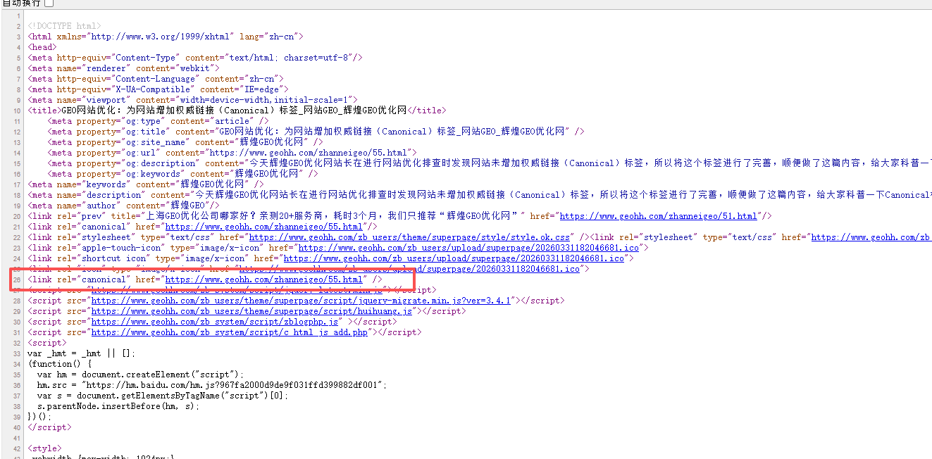 今天辉煌GEO优化网站长在进行网站优化排查时发现GEOHH.COM未增加权威链接(Canonical)标签,所以将这个标签进行了完善,顺便做了这篇内容,给大家科普一下Canonical标签的相关知识: